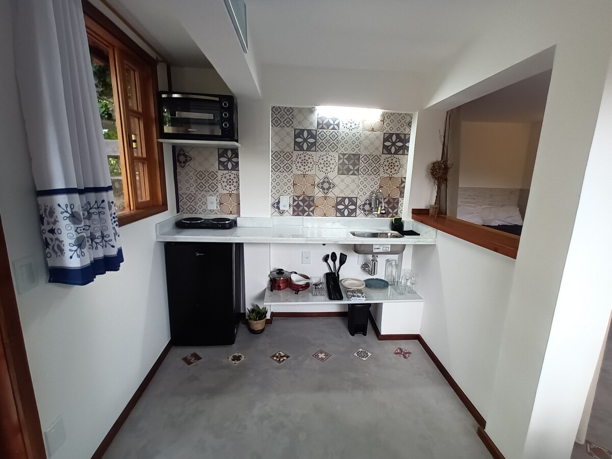 Studio para até 4 pessoas, com quarto separado (cama queen), 2 camas de solteiro na sala, banheiro privativo, ar-condicionado split e cozinha privativa integrada. Conta com chuveiro de alta pressão e enxoval 100% algodão. Entrada independente por fechadura eletrônica. Localizado no bairro São José, a 4 km da Praia de Geribá e 7 km do centro de Búzios.