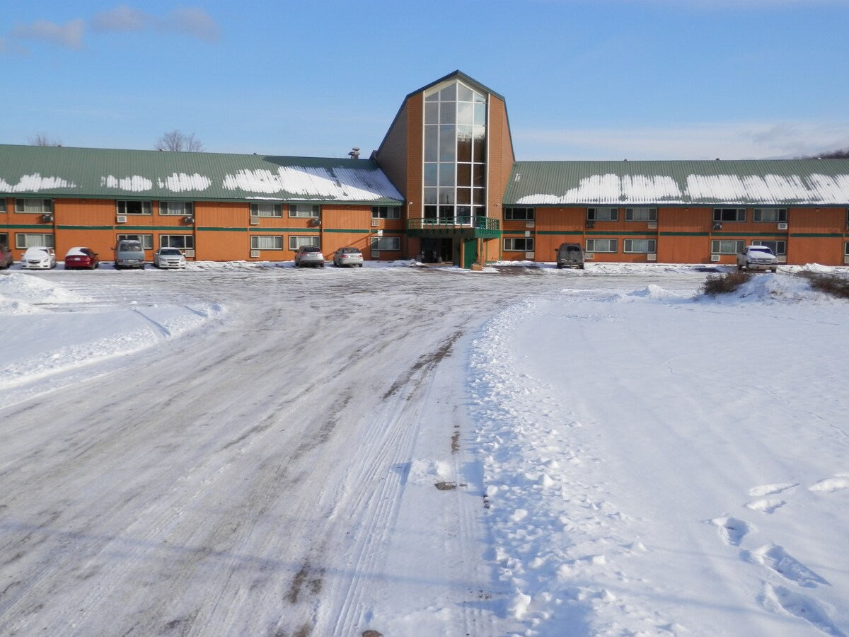 Apartamento completo con una cama tamaño queen en el dormitorio y un sofá cama en la sala de estar. Tiene capacidad para alojar cómodamente a 4 personas. También tienes acceso a una cocina completa. ¡Disfruta de la estación de esquí Snow River y de las rutas para motos de nieve a pocos metros de la propiedad en invierno o practica senderismo por las montañas Porcupine y otras actividades al aire libre en verano! Por el momento, no admitimos mascotas.