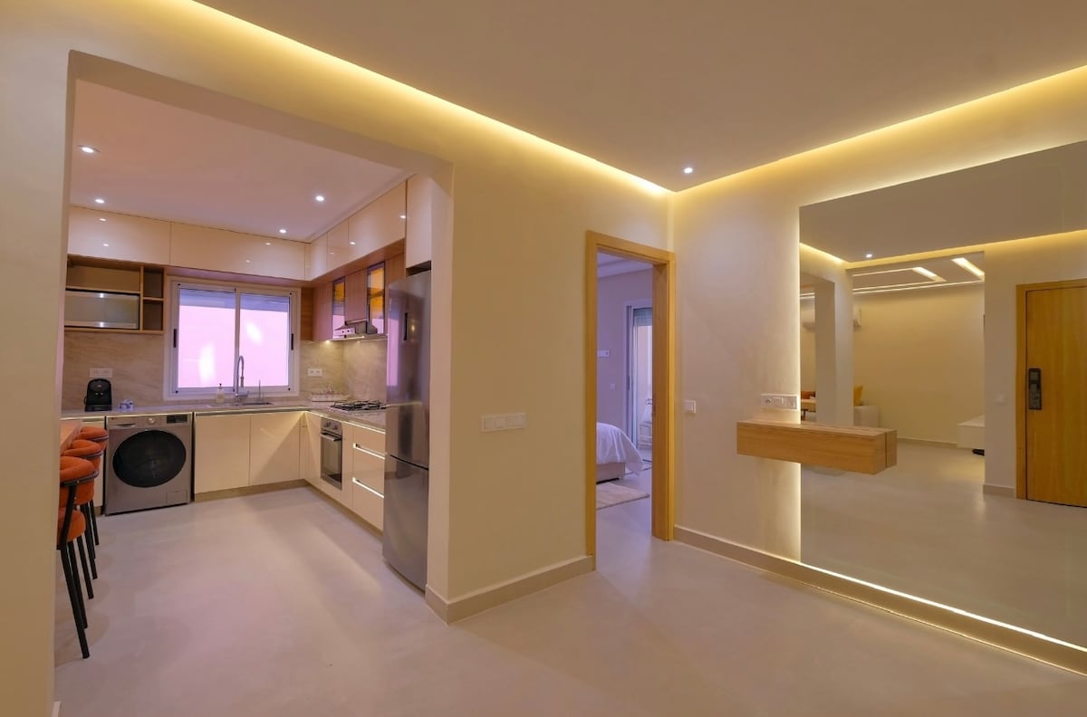 ¡Moderno apartamento en el corazón de Gueliz! A solo 2 minutos a pie del centro comercial Carré Eden, Starbucks, restaurantes y bares, y a solo 15 minutos del aeropuerto. Disfruta de 2 amplios dormitorios, 2 baños, una acogedora sala de estar con un televisor inteligente de 55 pulgadas (Netflix, YouTube, IPTV), una cocina totalmente equipada y una terraza soleada con impresionantes vistas a la montaña del Atlas. El estacionamiento seguro gratuito, el wifi de alta velocidad y la seguridad las 24 horas, los 7 días de la semana, lo convierten en el alojamiento perfecto en Marrakech.