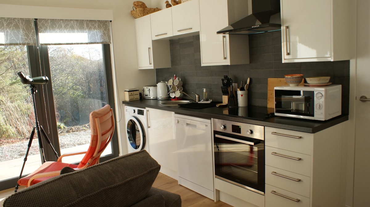 3 minutes from the ferry. You have access to Camard's own private estate of 87.5 acres of pastureland, Oak woodlands & waterfalls! Wild beachs within walking distance through the woods. Breathtaking views over the water to the mountains of Knoydart, which you may enjoy from the lounge or deck. Unwind, & completely digital detox, in one of the U.K,s most awesome, tranquil and beautiful locations. Forest tracks opposite. Please enquire 48 hrs in advance re booking a BBQ dinner if required. Relax