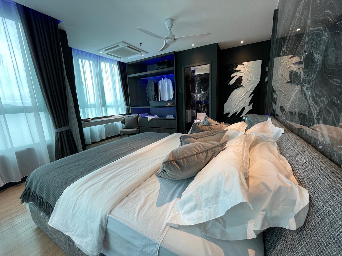 🍳Desayuno de cortesía para 4 personas 💡 Por razones de seguridad, no se proporciona plancha, pero hay un vaporizador de ropa disponible bajo pedido. ✔️ Unidad de 15F 2BR con balcón privado 🌊 Vistas: Bahía de Likas, Monte Kinabalu, Mezquita KK y Tun Mustapha 🛏️ Principal: 2 camas tamaño queen | Secundario: 2 individuales (sin ventanas) 🚿 Baños en suite y vestidores abiertos 🛋️ Sala de estar: sofá, TV inteligente de 55 pulgadas 🍳 Cocina americana: estufa, campana extractora, cubiertos, tazas 🍽️ Mesa de comedor para 2 ⚡ Wifi rápido
