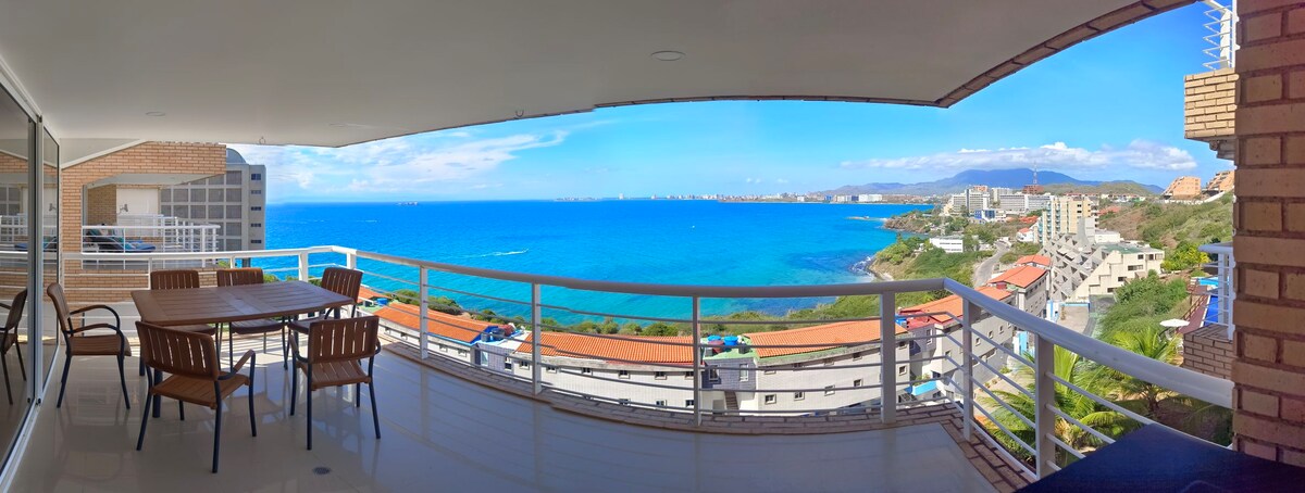 Apartamento con vista al mar y a la piscina, La Ubicación es espectacular, A escasos min de playas de Pampatar y de 5 a 7 min de centros comerciales (Sambil, La Vela, Costa Azul), supermercados y restaurantes. Habitación con cama king con vista al mar y a la piscina Comodidades: Internet Fibra Optica, WIFI, tanque de agua, piscina, cocina, aire central, calentador, lavadora, TV con Disney, Netflix Ideal para parejas o negocios Seguridad, Vigilancia 24/7 y estacionamiento privado incluido