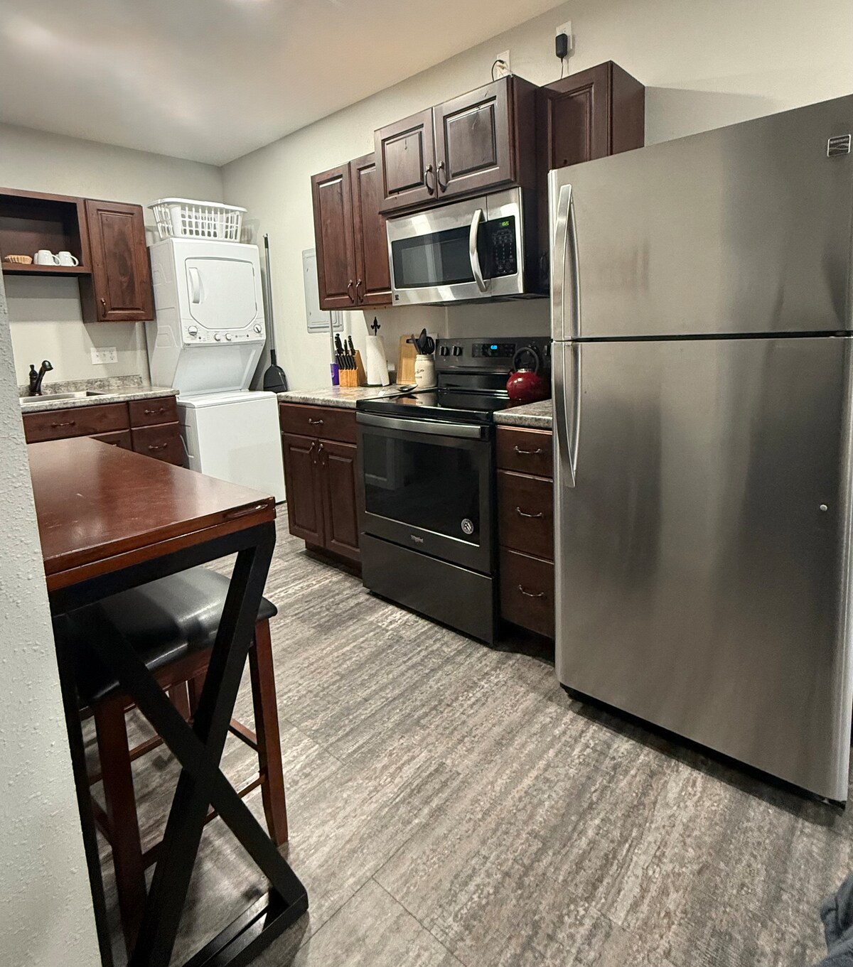 El nivel inferior de la casa de huéspedes es un espacio habitable totalmente amueblado separado con 2 dormitorios con camas tamaño queen y un tercer dormitorio con 2 camas individuales. Cuenta con cocina completa, sala de estar con TV de 50 pulgadas y wifi, baño con ducha a ras de suelo, lavadora y secadora. La entrada está en la parte trasera de la casa. ¡Gracias!