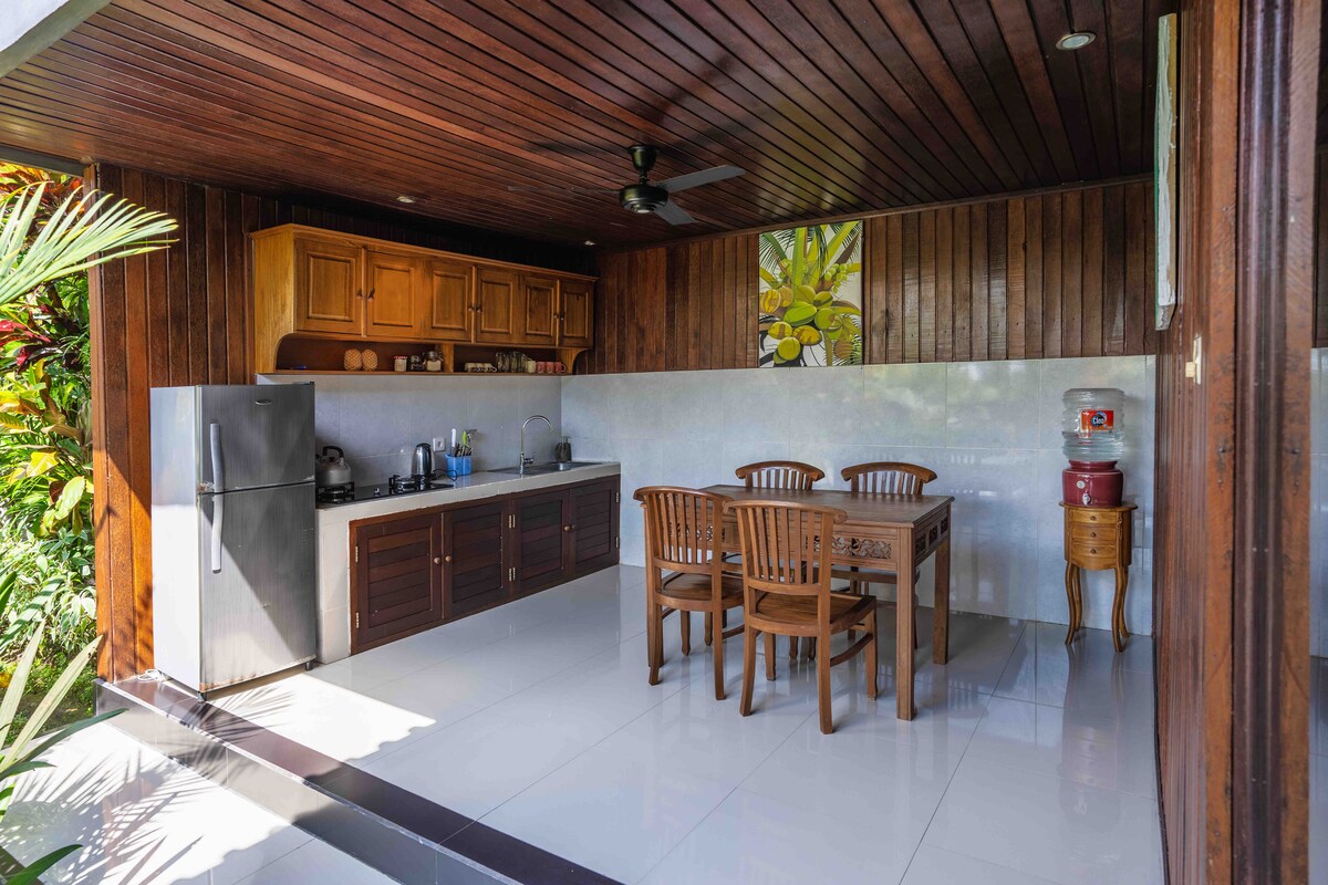 Lujosa villa privada con piscina de 6x3 metros. Segura, privada, protegida. Exuberante jardín y cocina protegida pero al aire libre para comer y relajarse junto a la piscina. Cama tamaño queen, bañera y ducha exteriores, con vistas al estanque de peces, cocina totalmente equipada. Aire acondicionado, televisión, excelente wifi, limpieza diaria y desayuno incluido. Estamos a 8 minutos a pie de la carretera principal o a un corto trayecto en scooter. Esto significa paz y tranquilidad, y sin ruido de coches. Nuestro personal estará encantado de llevarte en scooter si es necesario.