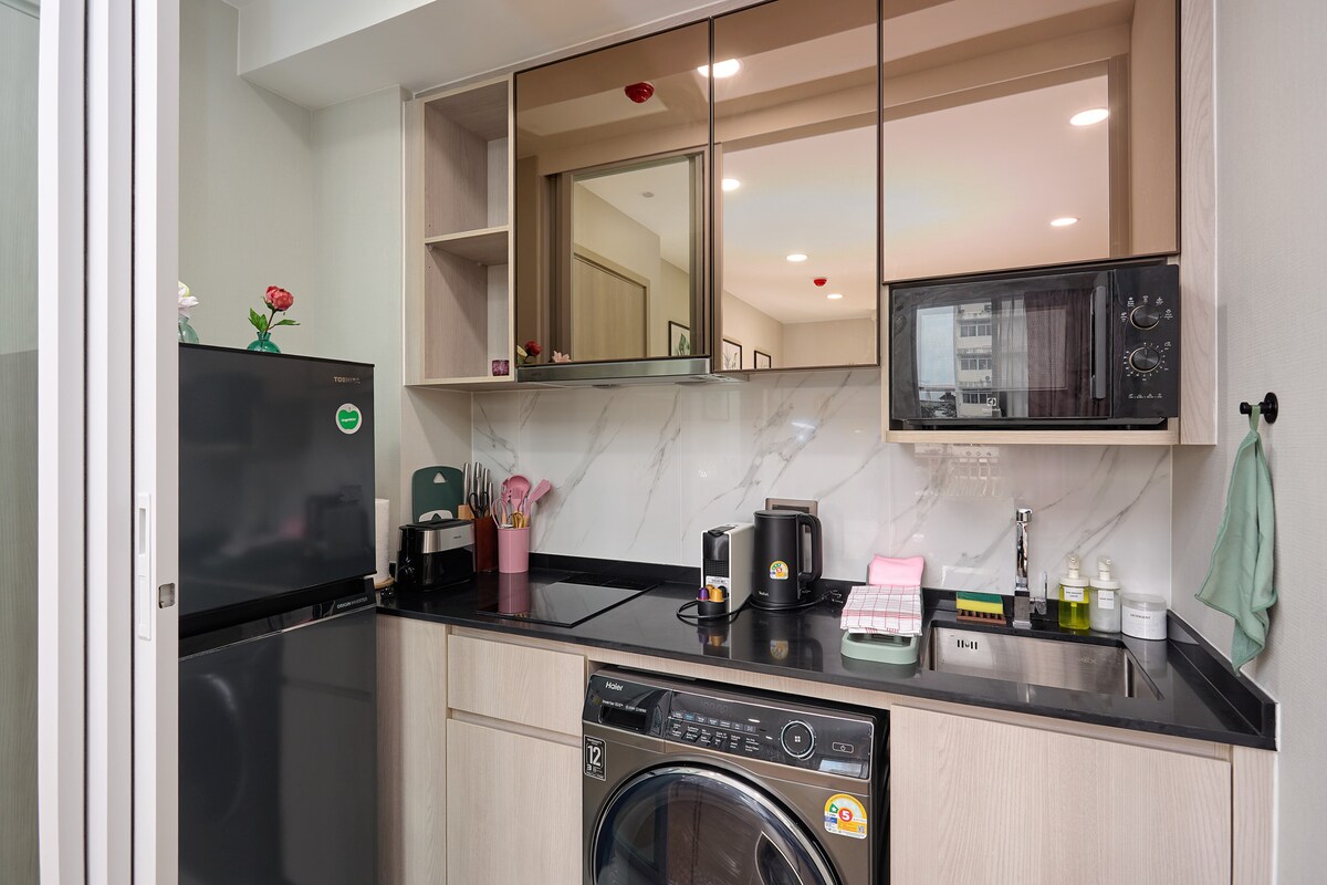 - 40 metros cuadrados de un dormitorio con cocina y lavadora en el edificio Bangkok Tryp. - No es adecuado para un niño. - No se permite fumar ni consumir cannabis. - Cerca de BTS N4 Sanampao, salida#3 (7 minutos a pie) - Sala de estar con sofá/baño privado con ducha, secador de pelo, artículos de tocador y toallas. - Aire acondicionado/Wifi/ TV/Caja de seguridad. - Almacenamiento de equipaje gratuito/seguridad las 24 horas. - Fácil llegada y de salida/plaza de aparcamiento gratuita. - Piscina y gimnasio *Los apartamentos están en 2-4 pisos, esquinas o unidades medias (dependiendo de la disponibilidad).