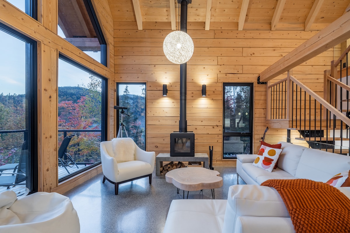 Small Scandinavian chalet for two people ideally located to enjoy the attractions of Charlevoix. It has a thermal circuit (hot tub, sauna, hammam) Very intimate and in the middle of the woods, the view overlooks the majestic river and the mountains in the distance. All the modern equipment is there and the comfort is absolute A/C and outdoor fireplace. The open concept design was designed for an immersive experience in nature: large windows, panoramic shower. Access via a private road at 500 m.