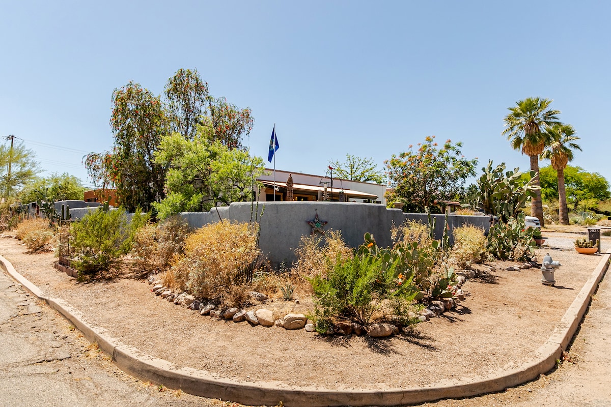 1937 adobe bungalow, located in the historic Palo Verde neighborhood, just minutes away from UofA, downtown, Banner Medical Center, Tucson Botanical Gardens and a few blocks from The Arizona Inn. Thick adobe walls and double-pane windows make it a quiet retreat. Enjoy the covered patio, mature well-tended desert landscape--front and back--and a private outdoor shower. Combines contemporary convenience with vintage charm, including high-end appliances and a cabinet/desk/murphy bed combination