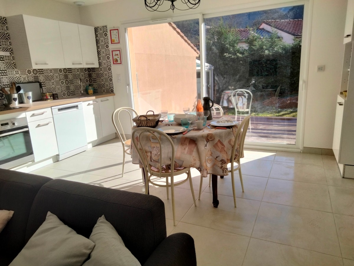 Entre el mar y la montaña… Con una ubicación ideal, al pie del macizo del Canigó, en el corazón del Parque Regional de los Pirineos Catalanes. ¡Cerca de baños de agua caliente naturales! Vivienda equipada independiente de 42 m², totalmente reformada. Se encuentra al final de nuestra villa en una hermosa propiedad de 3500 m². ATENCIÓN: NO HAY JACUZZI, SINO UNA SAUNA (18:00/21:00; 12 € la sesión) Piscina SOLO entre el 01/06 y el 30/09, reservas solo de sábado a sábado durante este período (1 semana mínimo).