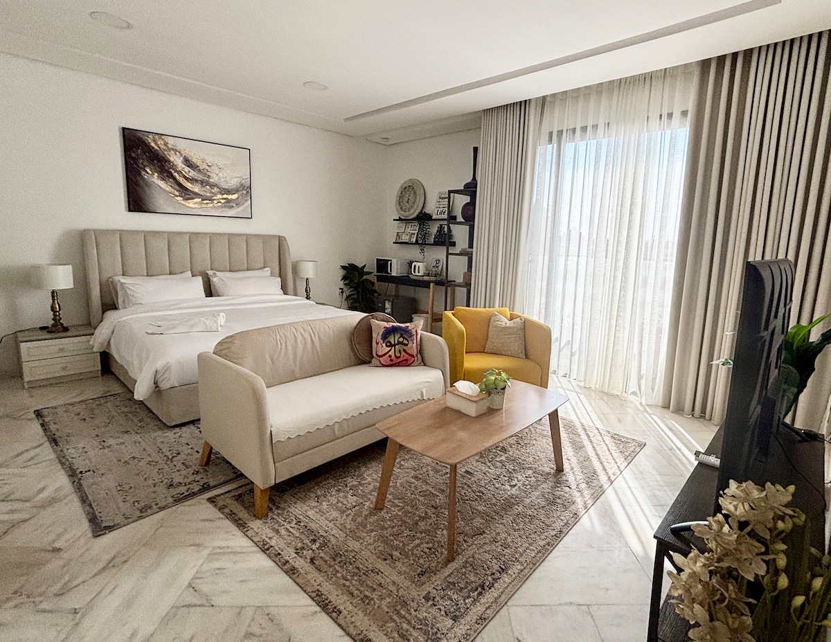 Enjoy your stay in this elegant and spacious studio apartment, designed with modern touches and cozy comfort. The space features: • Queen bed • Smart TV • Comfortable seating • Bathroom — all in one open, airy layout. 📍 Prime Location: • 10 min to Ajdan walk/ Corniche • 6 min to Dhahran Mall • 10 min to Aramco & KFUPM • 10 min to Bahrain Causeway • Only 2 min walk to Flamingo Mall Perfect for business travelers or couples looking for a relaxing, well-connected stay in Al Khobar.