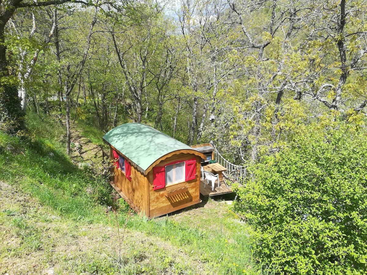 Descubriendo un valle, su río y sus sitios inolvidables. Una CABOULOTTE instalada en un espacio preservado, le ofrece con auténtica sencillez una estancia relajante. Ella está a punto de acomodar a 2 adultos y 1 niño . Con su terraza, su ducha, su inodoro seco, pequeña zona de cocina al aire libre, todavía hace de este lugar "momentos" de bienestar. le espera bordeada de rutas de senderismo GR 470. Te deseo un buen viaje.