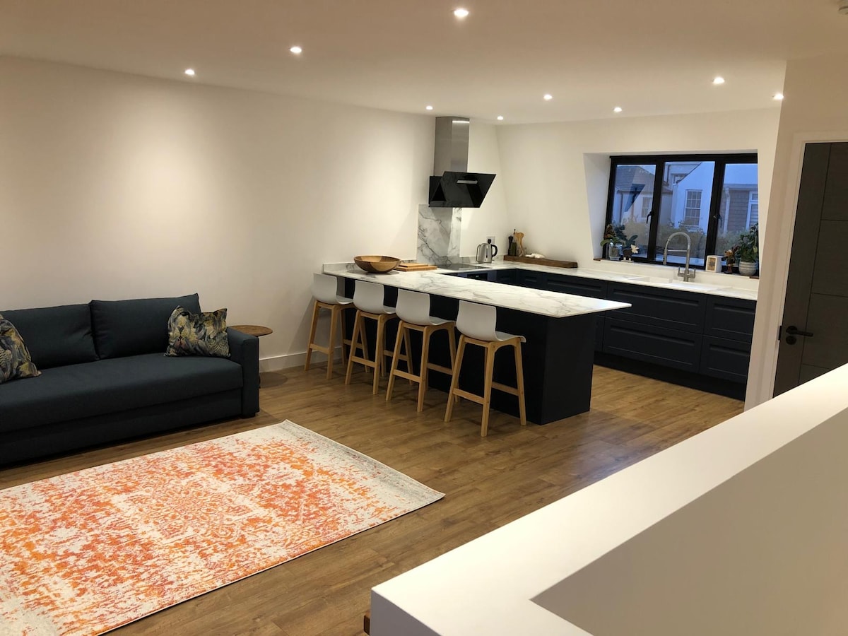 Large modern two bed three bathroom cottage across the road from the beach/ promenade/ cycle track. Nice bars and restaurants & Co-op very nearby walking distance to historic St. Aubin Village and harbour. Walk to town along the lovely promenade, or great bus route. Large kitchen breakfast-bar /lounge, 65" TV plus separate Very large comfortable lounge, 65"TV, double doors to patio garden. Bedroom 1, 1 double bed en-suite with spar bath. Bedroom 2 , 1 double & 1 single, en-suite with shower