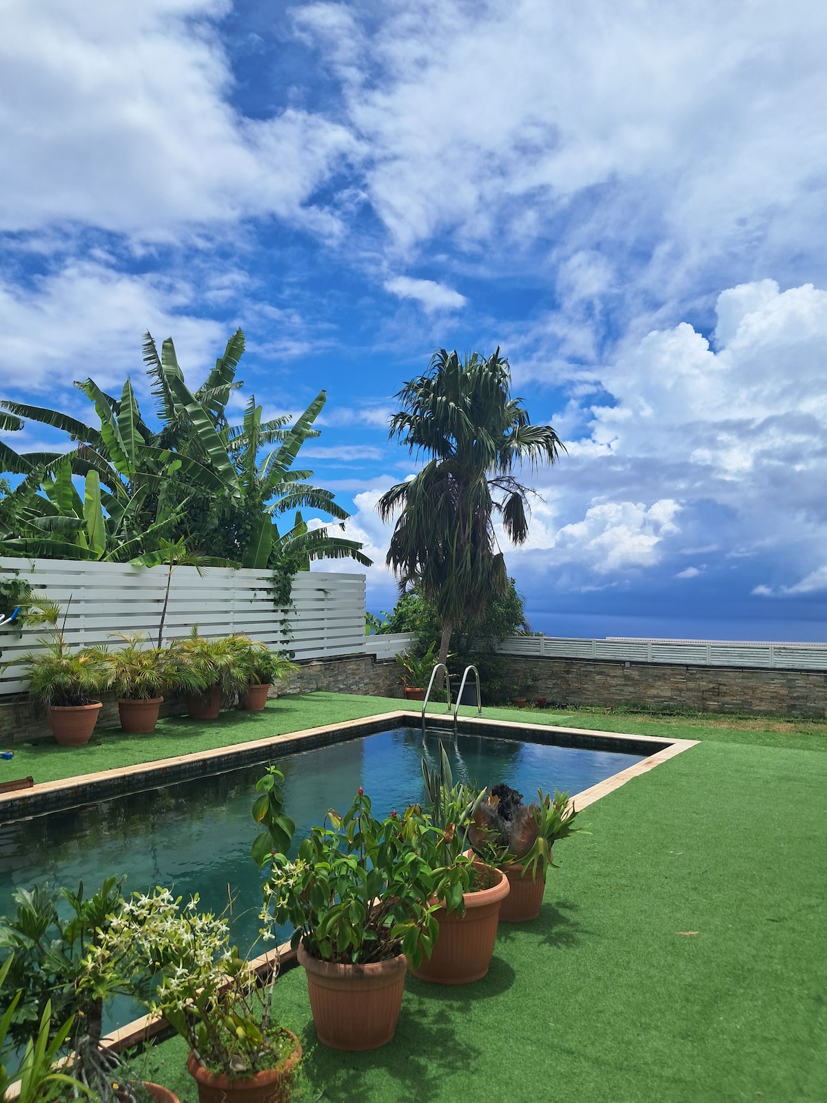 Magnifique demeure avec jardin, terrasse et piscine vue sur mer pour charmer vos vacances. Spacieuse et agréable, vous y serez très à l'aise ! Le logement dispose d'un séjour avec salon salle à manger,2 chambres doubles donnant sur la terrasse et la piscine, salle de bain et cuisine équipée. Située sur les hauteurs de saint Denis à saint François, quartier résidentiel, vous serez accueillis par la verdure et le chant des oiseaux.