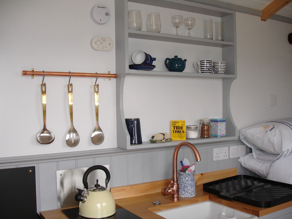 Encantadora cabaña de pastor de lujo en suite con acogedora estufa de leña, en un magnífico entorno de granja aislado, pero a 10 minutos en coche de los hermosos pueblos costeros de Cornualles de Port PayPal, Polzeath y Rock. El espacio principal tiene una cómoda cama doble, zona de cocina con nevera e instalaciones de cocina, una barra de desayuno y una estufa de leña. Hay un baño independiente con inodoro, ducha y lavabo. En el exterior hay una zona de patio con mesa y sillas y una chimenea para hacer barbacoas y relajarse por las noches.