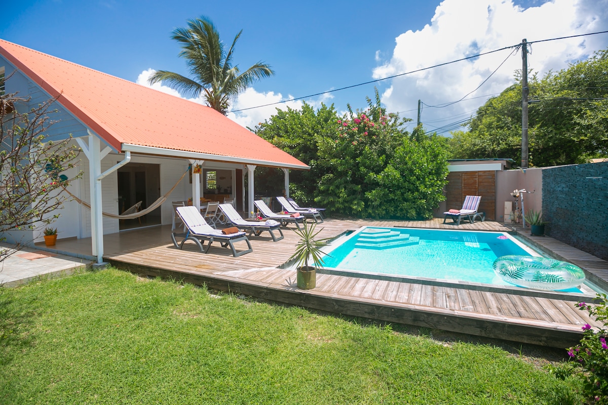 Este alojamiento elegante es perfecto para grupos. Descubra esta encantadora casa para unas agradables vacaciones en St Anne cerca de la playa de Bois jolan comercios 15 minutos a pie 3 hermosas habitaciones con aire acondicionado, incluyendo 1 suite principal con baño compartido 1 baño compartido gran cocina totalmente equipada una sala de estar con TV una hermosa terraza para sus comidas con zona de estar al aire libre para los aperitivos una piscina tratamiento con sal un jardín tropical tampón para rellenar el corte de agua