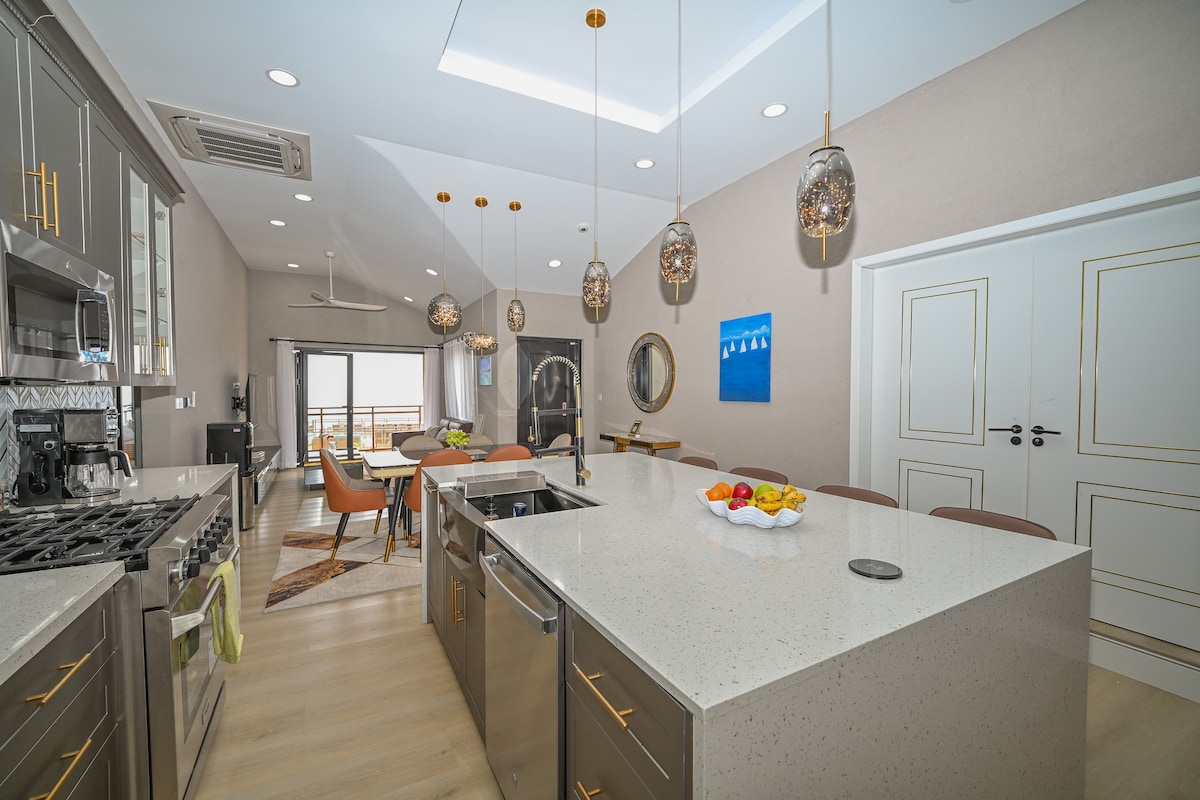 Golden Pear Villa-MSV Golden Apple Suite es un alojamiento lujoso, espacioso y cómodo de 2 dormitorios y 1 baño en Golden Pear Villa-MSV. Tiene una cocina completa con isla de chef, horno de cocina, lavavajillas, baño completo con ducha a ras de suelo, una cama tamaño queen y dos camas individuales que se pueden combinar en una cama tamaño king si se desea. Esta unidad cuenta con comodidades modernas para que tu estancia sea muy cómoda y se sienta como un hogar lejos de casa.