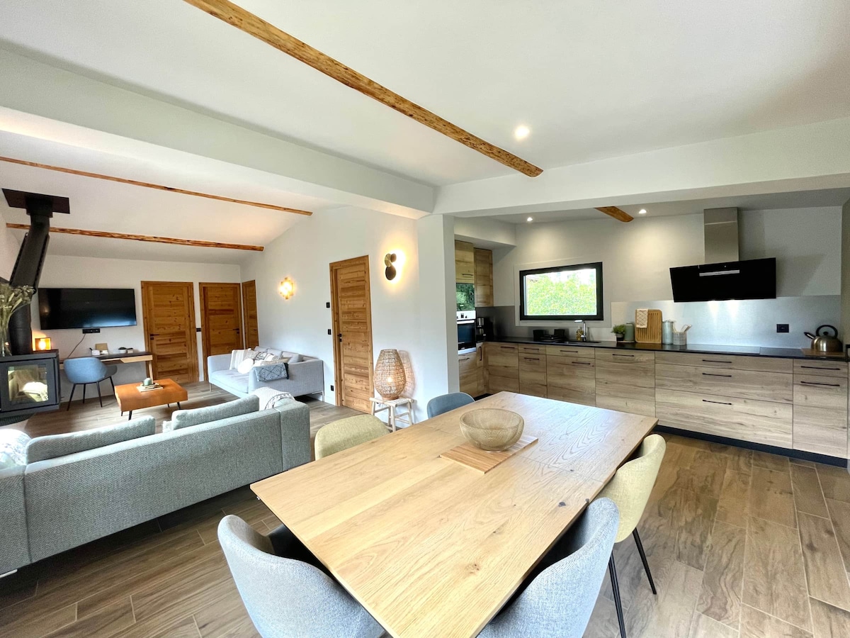 Grand chalet panoramique (190m2) face au Mont Blanc et proche d'un lac de baignade. Classé 4 épis. 4 chambres spacieuses (literie en 3*160cms et 2*90cms). 3 salles de bain dont 2 avec grande douche italienne et 1 avec baignoire. Sauna traditionnel avec vue panoramique par son hublot géant, vrai moment de détente et de récupération après l'effort ! Home Cinema - Babyfoot BONZINI - Enceinte CABASSE- Plancha Gaz etc...