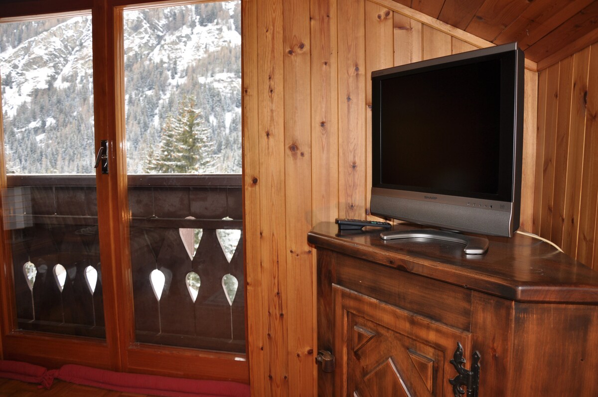 Montañas Alpes. Italia. Valle de Aosta. Una cabaña en un pequeño pueblo a 1600 metros,en la paz de prados, vacas de pastoreo y montañas. Nieve (por lo general) durante el invierno. Un lugar del corazón, restaurado con amor preservando las antiguas vigas del techo. Una vista maravillosa desde los grandes ventanales y una tranquilidad especial para aquellos en busca de paz, calidez y relajación. Los muebles son muy agradables: madera sobre todo, pero también colores más animados y comodidades modernas. Excursiones tranquilas, tanto en raquetas de nieve como en esquí.