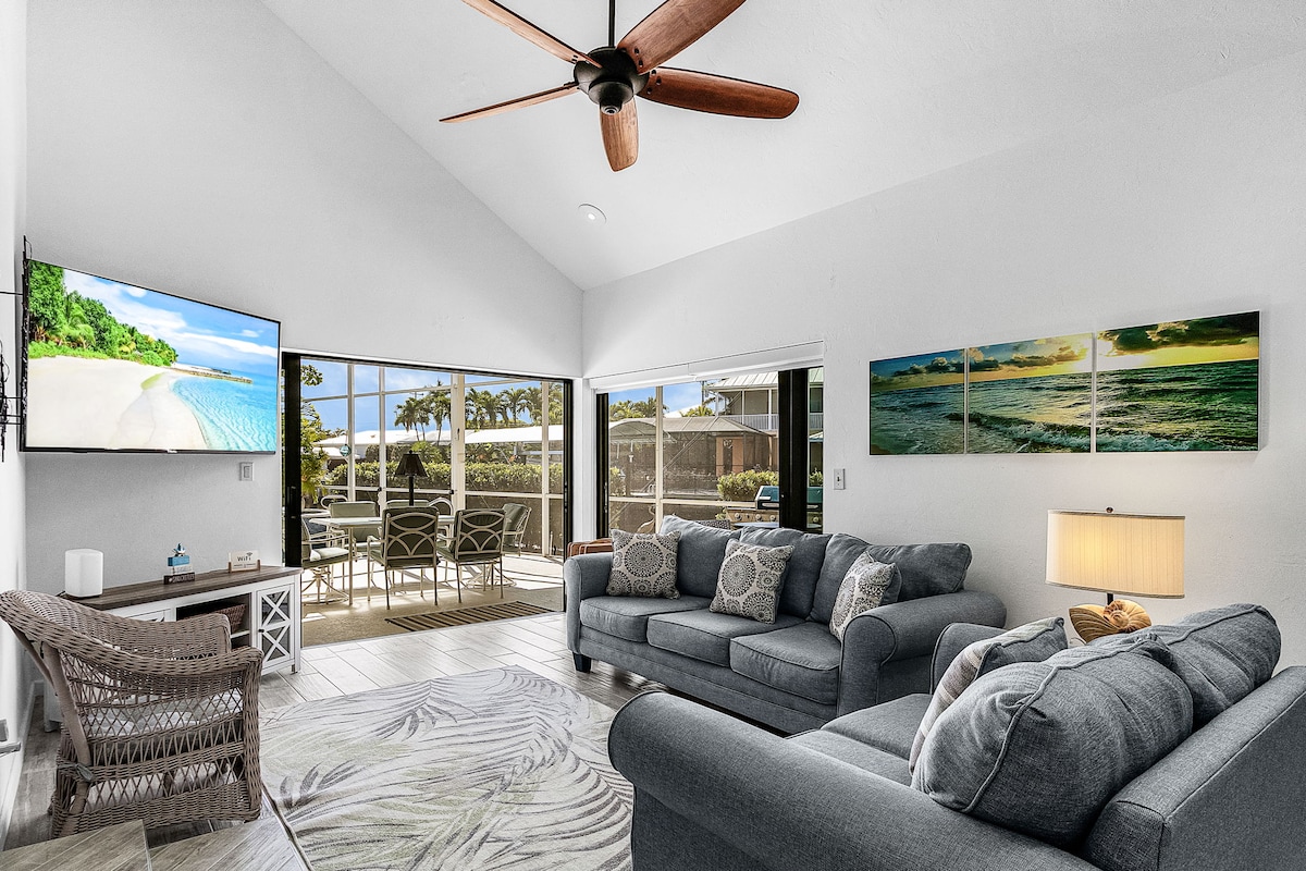 A minutos del océano, 2 dormitorios + estudio, 3 baños, piscina privada, final del canal Monroe, elevador de botes de hasta 21 pies, observa delfines, pesca justo al lado del muelle, kayaks, paseo en bote a solo minutos de Sanibel y Fort Myers Beaches, todas las comodidades de una vivienda + juegos de mesa, Playstation, 2 bicicletas para adultos con cascos. Relájate, disfruta del sol al aire libre con un bar y una terraza privada en la piscina: observa puestas de sol, bebe cócteles, ve delfines, pescado desde los muelles. ¡Ven a disfrutar de la vida frente al mar en su máxima expresión!