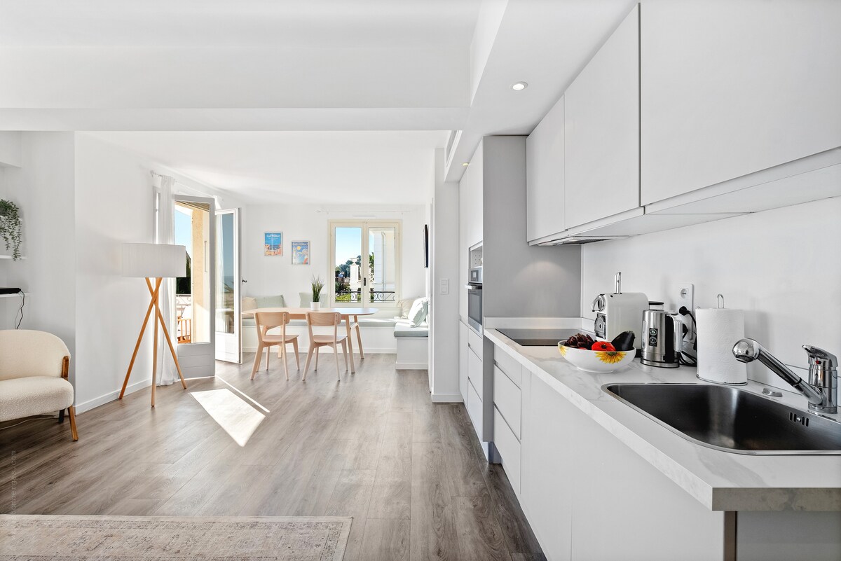 This bright and sunny apartment is situated on the top floor corner of a small traditional residence and benefits from a dual aspect. It has been thoughtfully renovated to provide a modern, practical living space, including a bright open-plan living-dining room with a fully equipped kitchen. The bedroom has a queen-size bed (160 cm). The living room has a sofa bed, ideally for children. The bathroom is newly renovated, and there is also a guest WC. A nice balcony with sea view.