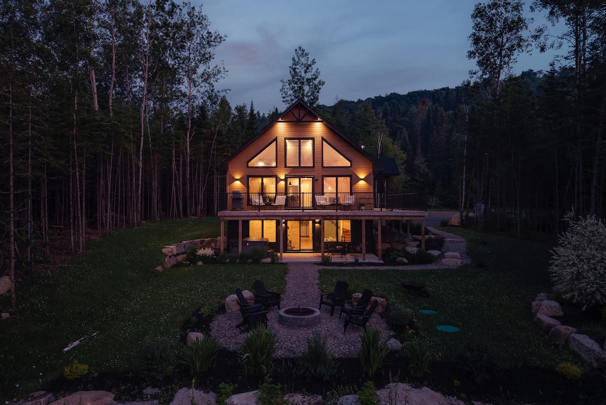 Escape to ROCKHaüs, a stunning modern chalet in the Laurentian Mountains near Mont Tremblant. This 3-bedroom architectural gem comfortably fits 8 guests. It features a panoramic glass dome sauna, a built-in hot tub, and breathtaking mountain views. Perfect for a luxurious retreat, it offers a unique blend of contemporary design and natural serenity with a cozy Scandinavian fireplace and expansive outdoor deck. Experience an unforgettable getaway with high-end amenities and private lake access.