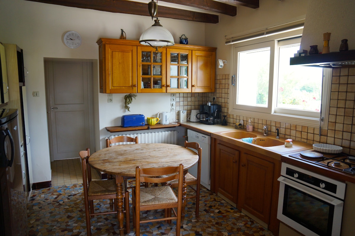 Le damos la bienvenida a nuestra encantadora y gran casa en el Valle del Querido muy tranquilo. A 50 minutos del castillo de Chambord, a 40 minutos del ZooParc de Beauval. Independiente, de planta baja, con su gran terreno cerrado arbolado, mantenido ecológicamente. Está equipada con una cocina equipada, comedor-salón. 3 dormitorios 1 cama de 160, 1 cama de 140, 4 camas de 90. 2 baños Un estudio comunicante (1 cama de 1,60 m) con baño, aseo, zona de cocina.