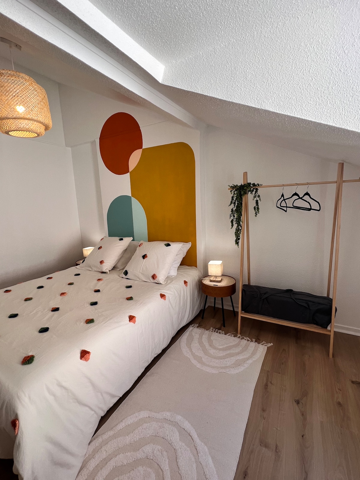 Amplio y luminoso, el alojamiento de 100 m2 se encuentra en el primer piso de una granja, antiguo corral. Magníficas vistas al huerto de 2500 M2, con terraza, muebles de jardín, sala de estar, barbacoa de gas, cama elástica, piscina, juegos para niños..... Este alojamiento data de 1784, restaurado con elegancia. Decoración nórdica y moderna, muy cálida, un verdadero nido con naturaleza y tranquilidad. Ideal para reponer energías en vacaciones. El corral está bien situado para visitar ciudades y pueblos vinícolas.