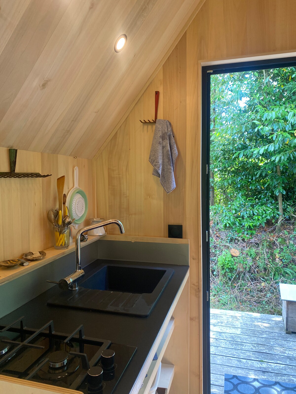 12 mètres carré de cocooning 100% bois en pleine nature pour se ressourcer en plein cœur des Monts d’Arree. À 200 mètres, l’Ecomusee de la Maison Cornec, une épicerie de producteurs, deux restaurants. Des départs de randonnées dans toutes les directions pour petits et grands marcheurs. Position centrale pour aller vers la côte nord Finistere, Presqu’île de Crozon et sud Finistere.