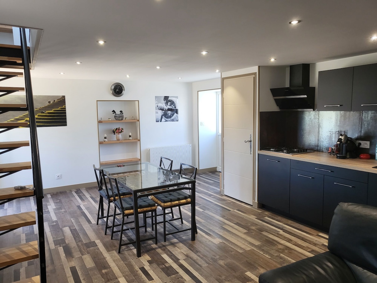 Logement charmant, en duplex avec tout le confort nécessaire pour passer un bon moment. Avec un extérieur pour profiter pleinement. Le logement fait 50m2 En bas vous trouverez une cuisine tout équipée et en haut vous disposerez d'un coin nuit avec un lit tout confort (200/200) ainsi qu'un canapé lit pouvant accueillir 2 autres personnes. Vous trouverez aussi un coin télé, jeux et bibliothèque. Quartier calme. Draps/serviettes de bain fournis. Wifi. Netflix. Chaînes TV freebox.