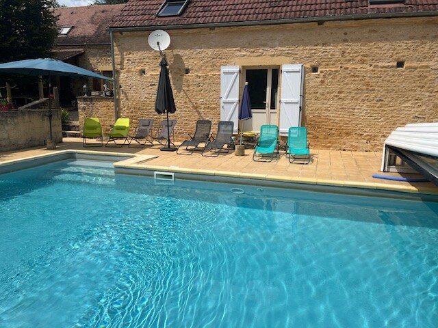 casa perigordina situada en la D704A. con piscina 10 x 5 asegurada por alarma de detección,totalmente vallada y puerta motorizada con mando a distancia. 5 km del centro histórico de Sarlat la Canéda 2 parques de escalada cerca,río Dordoña está a 5 minutos,varios sitios en los alrededores (castillos,cuevas, Lascaux, etc.) y ocio ( canoa,globo aerostático,etc.) Debe realizar la limpieza o los gastos de limpieza con un suplemento de 100€
