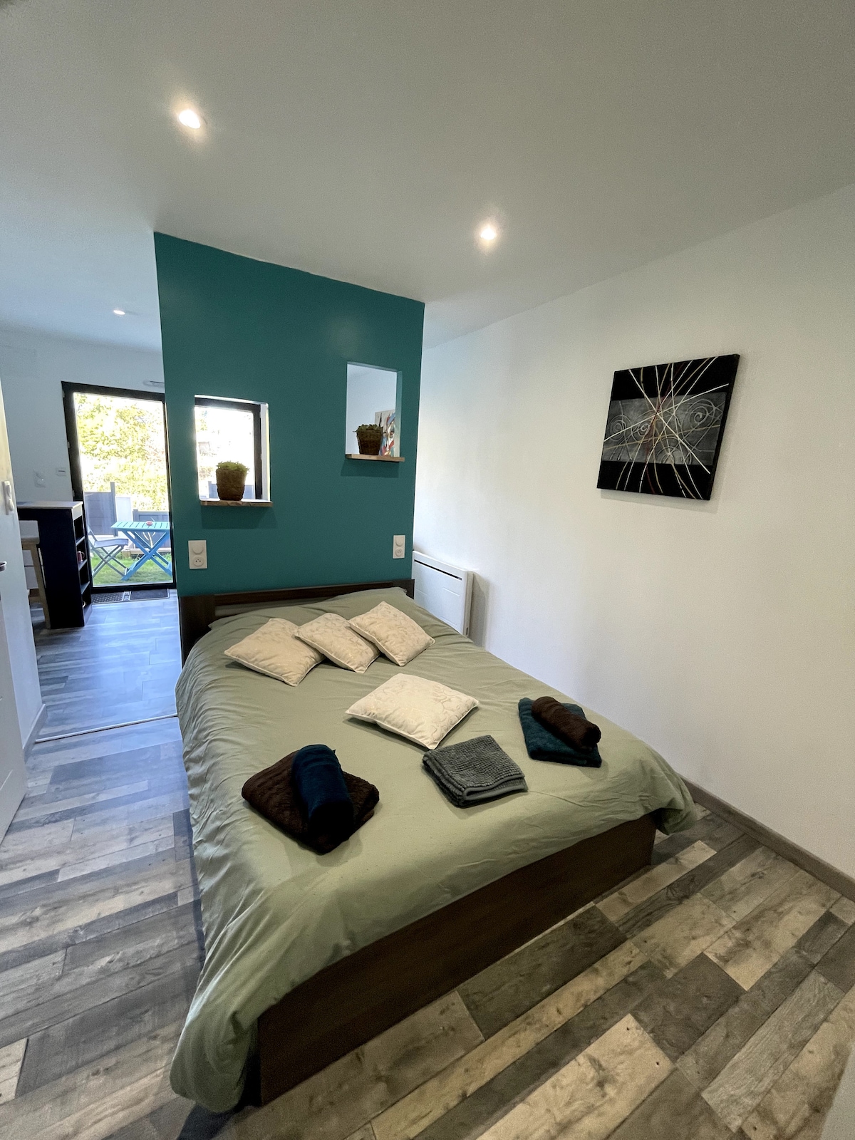 Habitación totalmente equipada, de unos 14 m², con una cama grande, un baño con inodoro, una zona de cocina con nevera y placa eléctrica extraíble y utensilios de cocina. Hay una terraza equipada con barbacoa, mesa y muebles de jardín. Muy cerca del centro de la ciudad con todas sus comodidades restaurante,comida rápida, pizza,monumento .....y sobre todo a 2 pasos de las arenas 😍.Barrio tranquilo, con amplio aparcamiento gratuito a 30 metros y aparcamiento de pago excepto fines de semana.