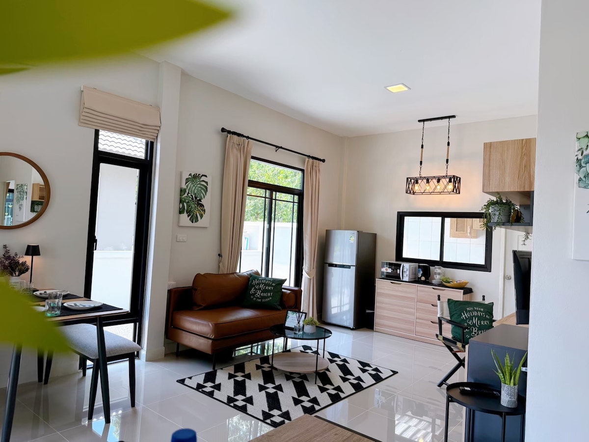 El jardín de al lado puede preparar una barbacoa y comer al aire libre. Se puede plantar con árboles o verduras. El propietario de la casa es bueno y amable. Cerca del polígono industrial 304. Bangkung Bamboo Bridge, Sa Morakot Ancient Pond, Boran Sathan Sakaeo y el Parque Nacional Khao Yai. Adecuado para familias o aquellos que necesitan una vida tranquila y discreta.