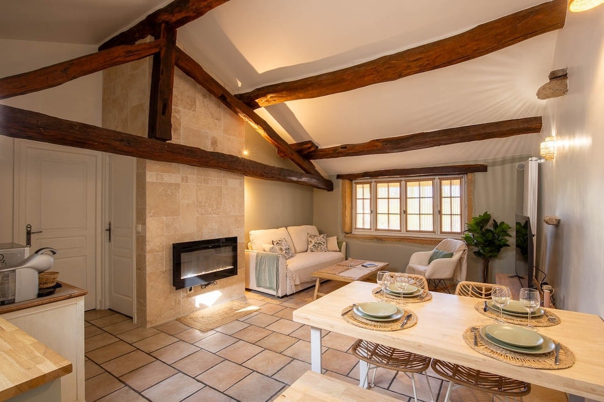 Escape to the third of our charming gîtes for 2 to 4 guests, just a stone’s throw from Lyon, in the quaint village of Vaulx-Milieu. This peaceful retreat combines rustic charm with modern comfort for a unique and unforgettable getaway. Relax in our private spa on the ground floor, featuring a 4-person jacuzzi and infrared sauna. Upstairs, the air-conditioned living area includes a kitchen, living-dining room, bathroom, and 2 bedrooms. The accommodation is entirely private. PARTIES ARE NOT ALLO