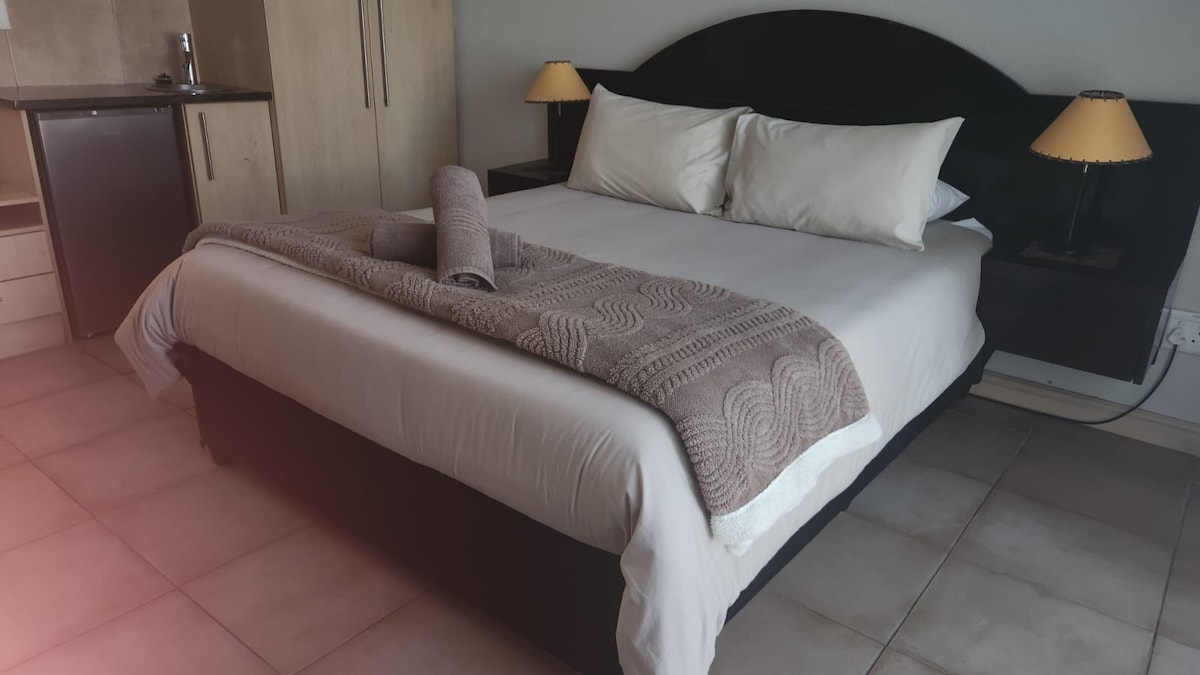 The deluxe queen room features a queen-size bed ,an en-suite bathroom with a shower. For entertainment, it offers a TV and Wi-Fi. Guests can also enjoy tea and coffee-making facilities, a microwave, and a private patio with a garden view for relaxation.