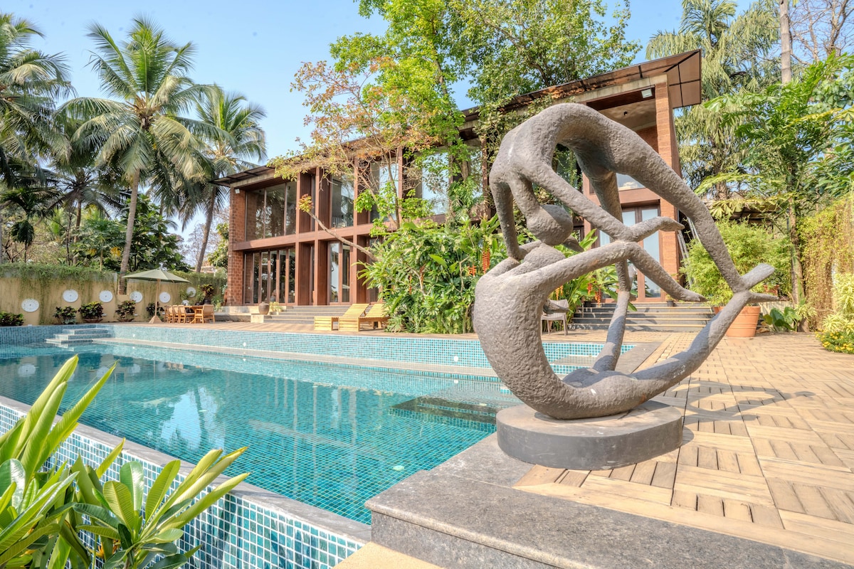 La Glass Villa de ZenAway Stays es un espacioso alojamiento de 8,000 pies cuadrados (743 metros cuadrados). Villa privada de 4 dormitorios en Aldona, Goa Norte, con una impresionante costa, una piscina privada infinita, jardín, comedor al aire libre y zonas para sentarse. Administrada profesionalmente y con servicio diario que incluye desayuno de cortesía, esta villa de lujo ofrece un espacio lleno de luz, un entorno tranquilo y una transición fluida entre el interior y el exterior, ideal para familias y grupos que buscan privacidad y comodidad refinada.