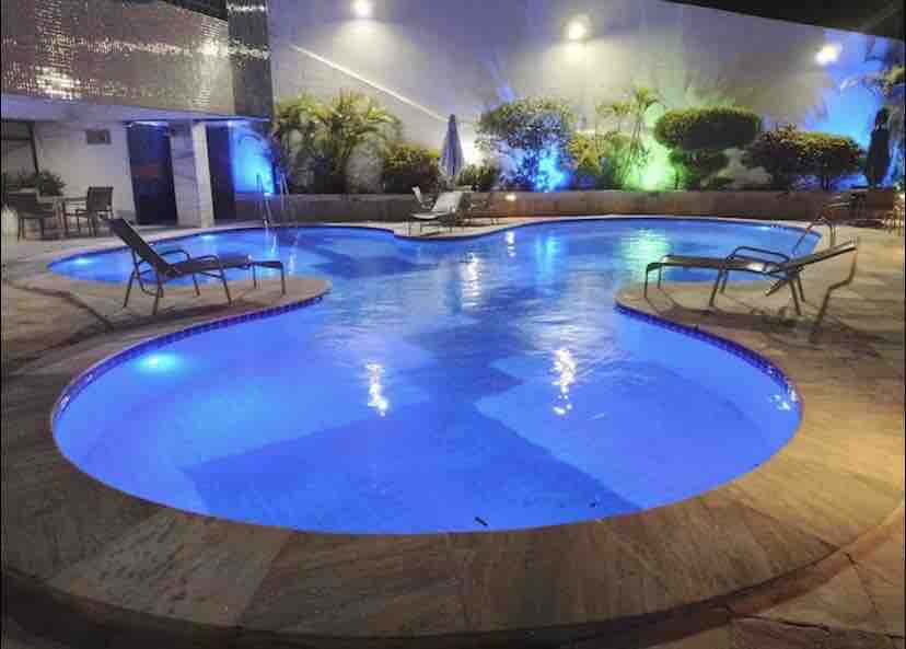 O apartamento possui dois quartos com ar condicionado e varanda, sala e cozinha e é um flat no Hotel Mercure Boulevard Salvador e conta com toda a estrutura do hotel que inclui piscina externa, piscina coberta, academia, restaurante e parquinho entre outros. O acesso é feito através da recepção do hotel e o imóvel conta ainda com três vagas de garagem de uso gratuito, Wifi e TV a cabo. A limpeza é feita duas vezes por semana link anterior https://www.airbnb.com/h/flatnomercureboulevard