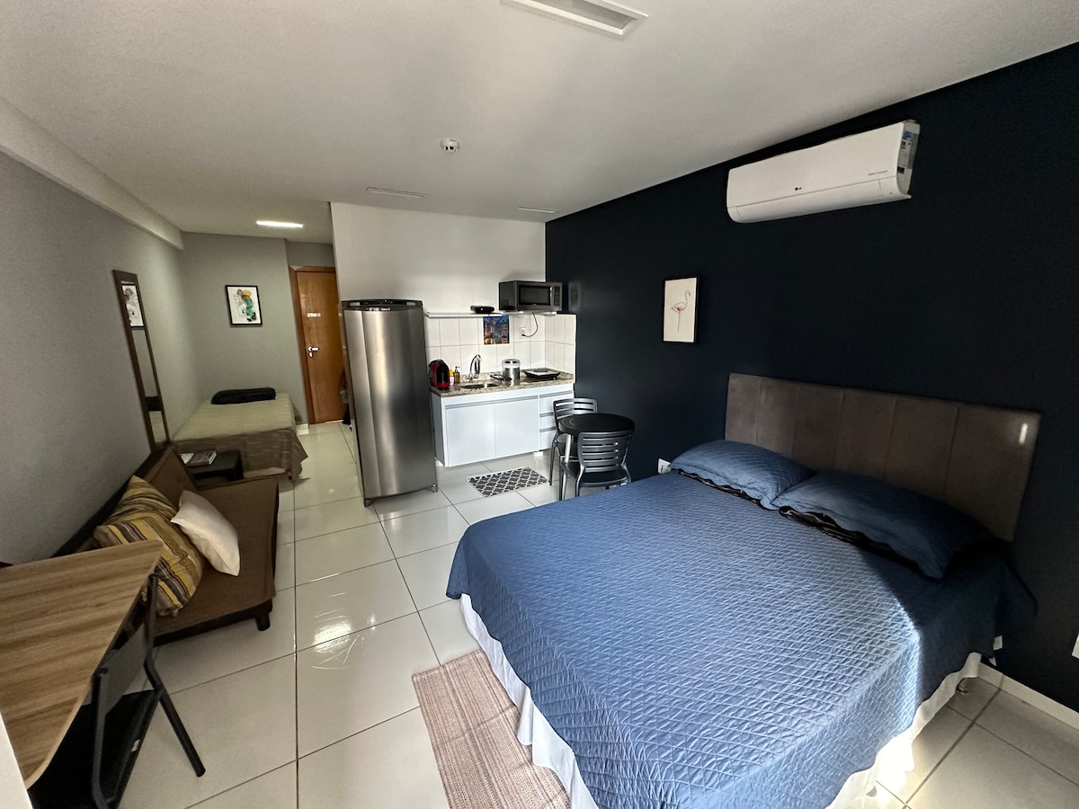 Hola, el alojamiento es en forma de estudio, con una cama doble + cama individual, además de tener una cocina con nevera Frost Free, microondas, cafetera, TV inteligente y varios artículos para una estancia cómoda. Casi todos los equipos y muebles son nuevos. Ubicado en la principal región de negocios de la ciudad, está a pocos metros de Shopping Salvador. LLEGADA: a partir de las 14 h. (Si tienes que hacer el check-in antes de las 2:00 p. m., comprueba la disponibilidad) SALIDA: MEDIODÍA * 1 espacio de estacionamiento.