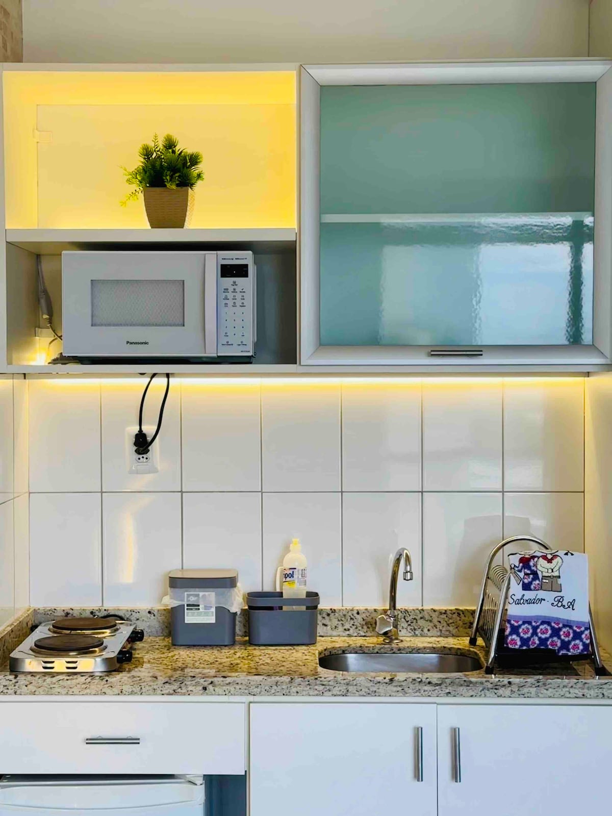 Excelente studio flat muito confortável e único no charmoso bairro de Caminho das Árvores de Salvador. Espetacular localização a 150m do Salvador Shopping, no coração da cidade e perto de tudo. Proximidade da estação de metrô. Local tranquilo e seguro. O studio possui ferro de passar, sanduicheira, cafeteira, cooktop por indução, filtro de água e geladeira. Cozinha completa e contém vaga de garagem incluso. O lugar comporta confortavelmente 4 hóspedes.