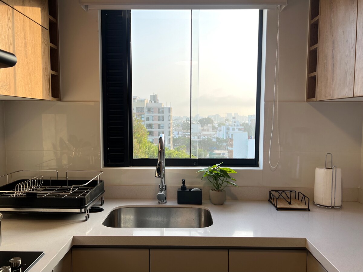 Moderno loft de estreno, muy bien ubicado y con increíble vista panorámica desde el piso 35. Fácil acceso a avenidas principales, centros comerciales, museo, tren, centro financiero, clínicas, gimnasios, parques. Cuenta con lavandería, baño principal , kitchenette, cocina equipada, walking closet, agua caliente, TV y WIFI. Áreas comunes: mirador de la ciudad, Rooftop, Co-working. Cerca a distritos turísticos como Miraflores, Barranco y Centro Histórico de Lima.