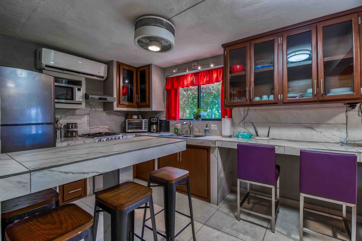 Casa de Altman es una propiedad boutique ubicada en la Bahía frente al agua, donde los huéspedes pueden relajarse junto al agua, salir en kayak para explorar las orillas, nadar en la piscina, hacer kayak o simplemente ver la puesta de sol desde una de las muchas palapas. "Casita 3" ofrece un espacio inmaculado de dos dormitorios en el nivel inferior con una cocina pequeña, sala de estar con un sofá cama, un segundo dormitorio tiene una cama tamaño queen y un baño, con un dormitorio principal con una cama tamaño king y baño privado.