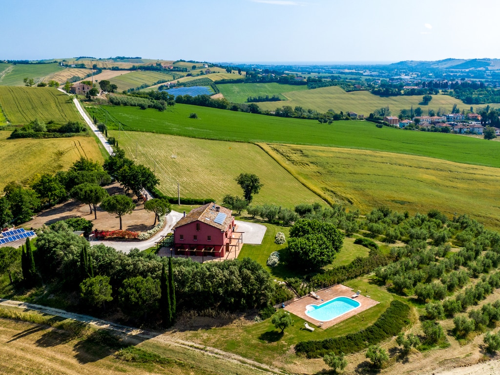 Acogedora casa de vacaciones inmersa en las verdes colinas de la región de las Marcas, a 20 km del mar, hacia el interior de Fano. Apartamento independiente, que consta de cocina, sala de estar con chimenea, tres baños y cuatro dormitorios. Un gran jardín permite paseos y relajación para aquellos que aman la paz y los espacios abiertos. Con un panorama que ofrece impresionantes amaneceres y puestas de sol. Adecuado para familias con niños, jóvenes y parejas que estén buscando unas vacaciones entre la naturaleza, el mar, las experiencias culturales y gastronómicas.