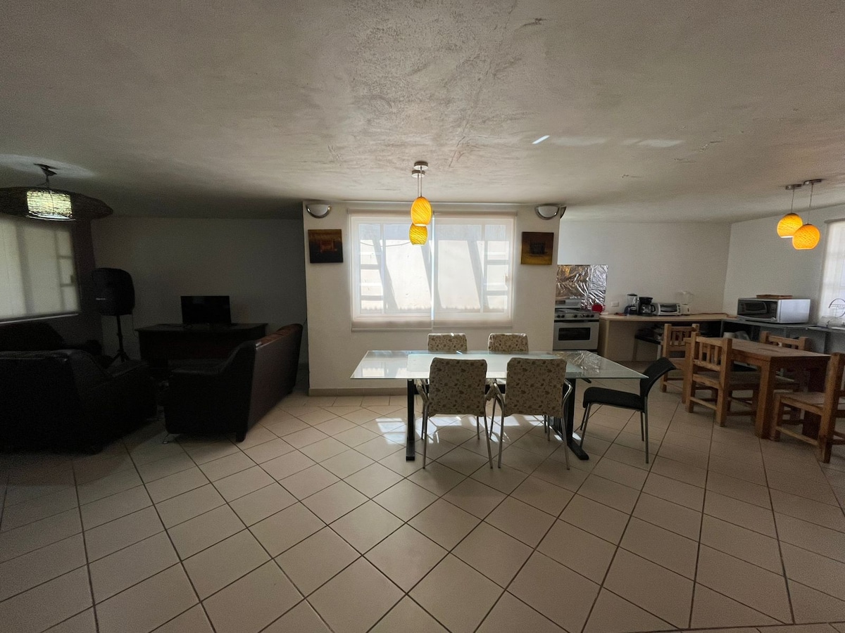 Disfruta de este cálido alojamiento monoambiente de espacios abiertos sin muros increíble para descansar y realizar tus actividades elementales cuenta , entrada independiente y cochera para un vehículo (precaución el cajón de estacionamiento tiene 3 metros de ancho resulta angosto para un vehículo grande), una pequeña cocina, baño completo, televisión, comedor y 1 cama matrimonial se encuentra a 5 minutos de plazas comerciales y a 20 minutos del centro histórico