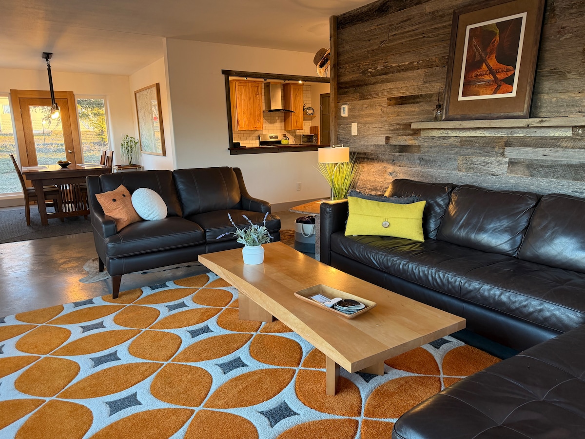 Inviting two bedroom bungalow with unique, private, and spacious outdoor space. New, comfortable beds, wood burning stove, artisan hand-made furniture. New heating and AC system. Two dedicated work spaces and 1G fiber internet for remote work! The most shade and privacy you'll find in town. Help yourself to the fruit trees, enjoy the stars and mural of Factory Butte from a hammock, fire up the grill for some patio dining and take a selfie in the #DirtyDevilSaloon