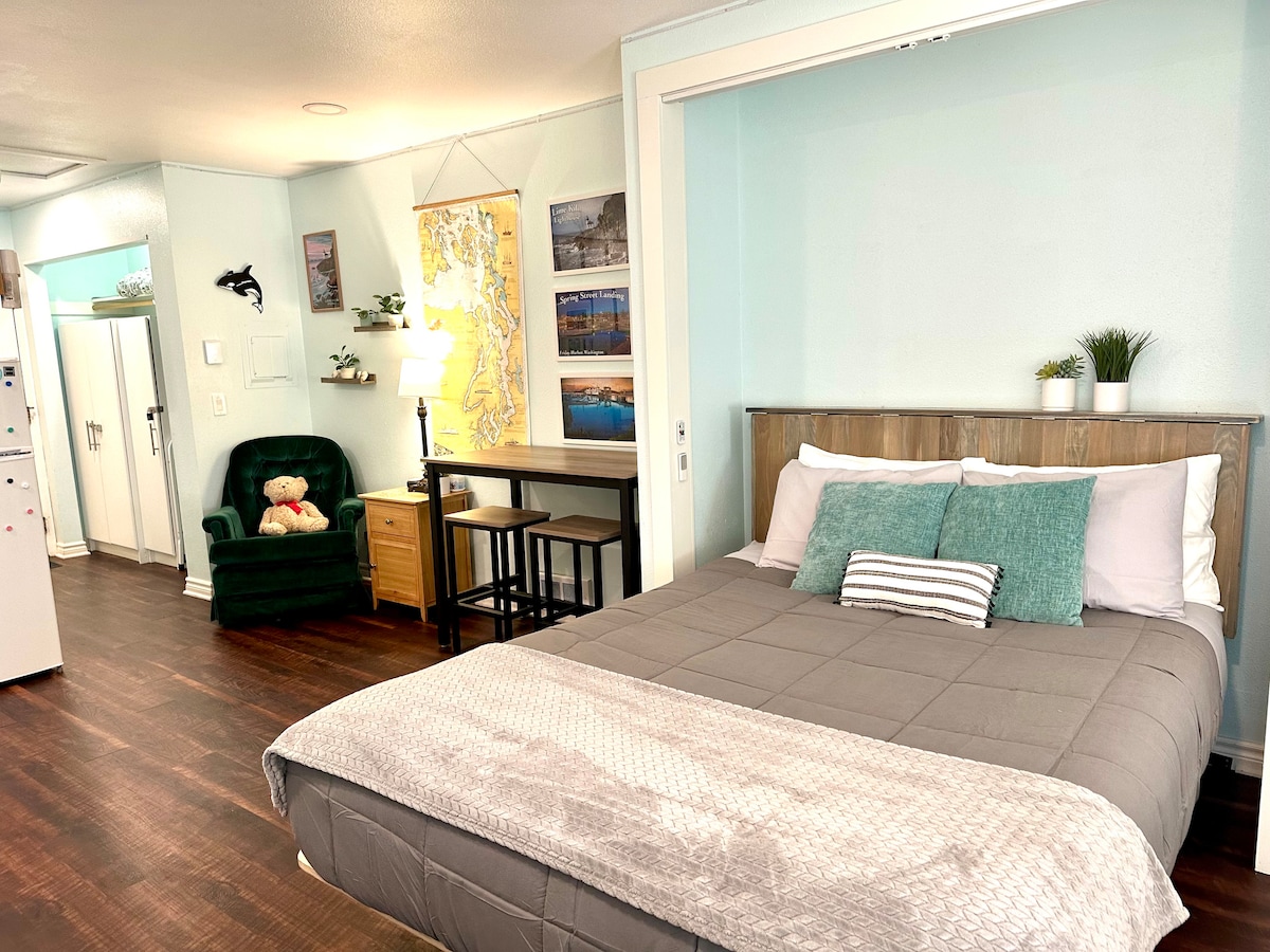 Ubicado en la histórica aldea de Olga, Little Stuga ofrece un refugio tranquilo convenientemente ubicado a pocos pasos del agua, dos playas y un muelle público. Los espacios interiores llenos de luz proporcionan comodidad y conveniencia sencillas, ideales para parejas, familias pequeñas o viajes de trabajo remotos. Moran State Park, Doe Bay y Mt Constitution están a 5 minutos en coche, con Eastsound a solo 10 minutos. Vistas al agua en ambos niveles, sábanas de alta gama, cocina pequeña totalmente equipada, todo en un espacio cuidadosamente diseñado
