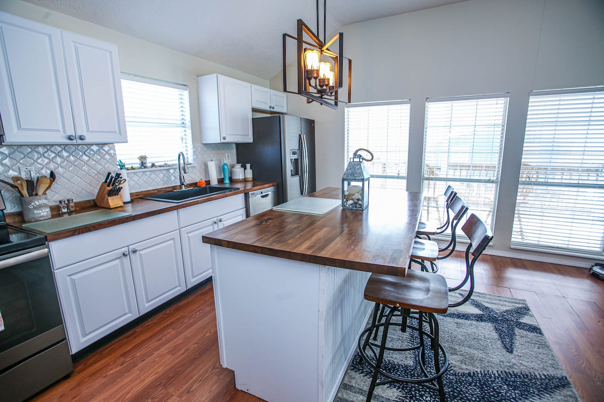 ~Sunset House~ en San Luis Pass está situado en el centro entre Surfside y Galveston, perfecto tanto para pescadores como para familias. Rampa pública para botes a través de Bluewater Hwy y playa y muelle de pesca. Si no buscas un oasis de pesca, dirígete a 2 MANZANAS a pie del acceso directo a la playa. Esta hermosa casa de 3 dormitorios y 2 baños con un porche envolvente y un espacio de trabajo tiene todos los servicios que puedes imaginar y hermosas vistas del amanecer y el atardecer. ¡Haz ~Sunset House~ TU hogar Y TU hogar, ¡TU hogar!