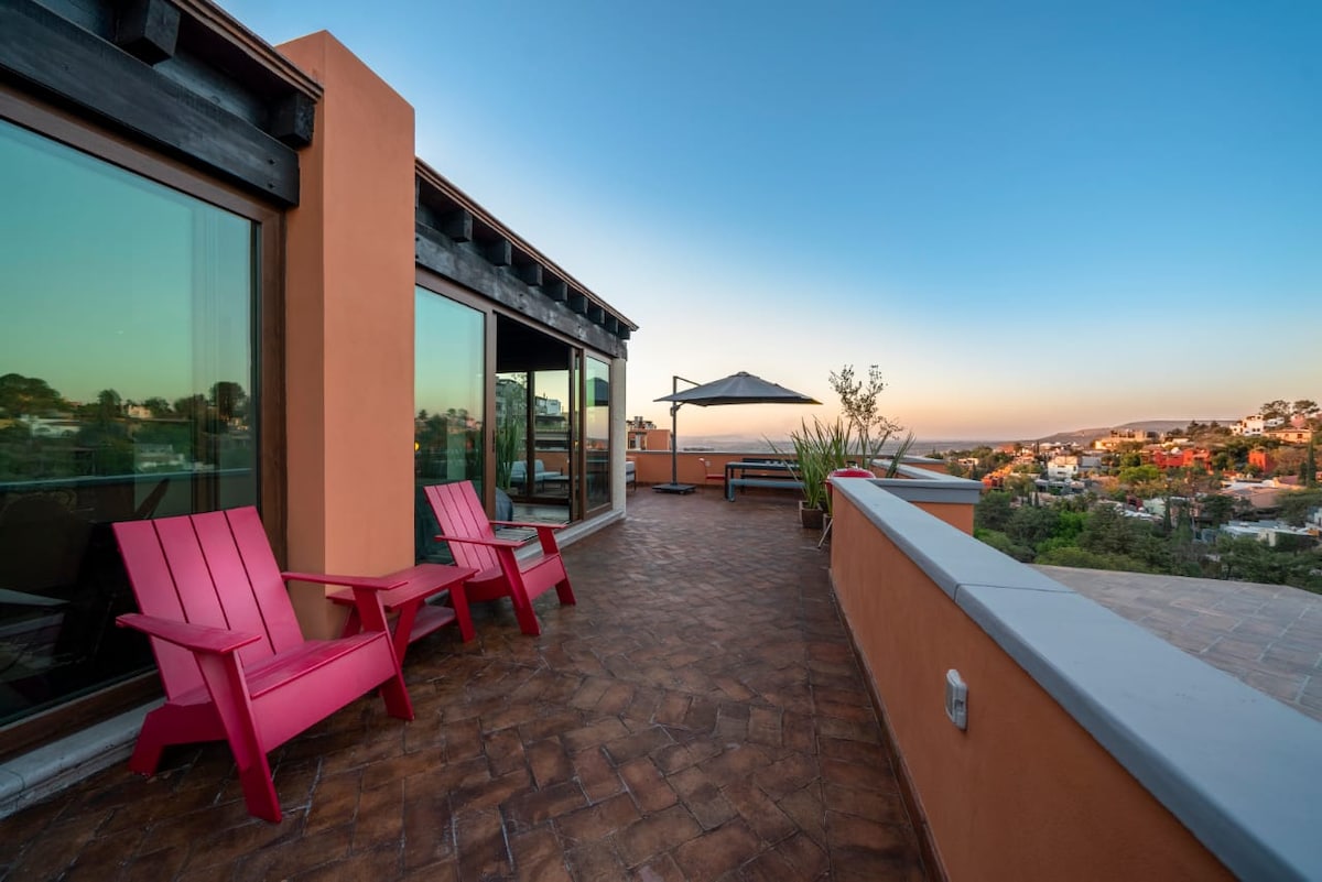 The tallest patio in the entire neighborhood - Casa de las Nuebes (house in the clouds) will not disappoint! A perfect couple’s retreat or 2 friends. This beautiful interior designer owned studio has all the magical qualities that visitors love about San Miguel. Walk just a few minutes from Centro to a gated 6 unit condo unit that is very safe and away from the downtown noise. Enjoy the stunning 360 view of morning hot air balloons, sunsets and all of SMA!