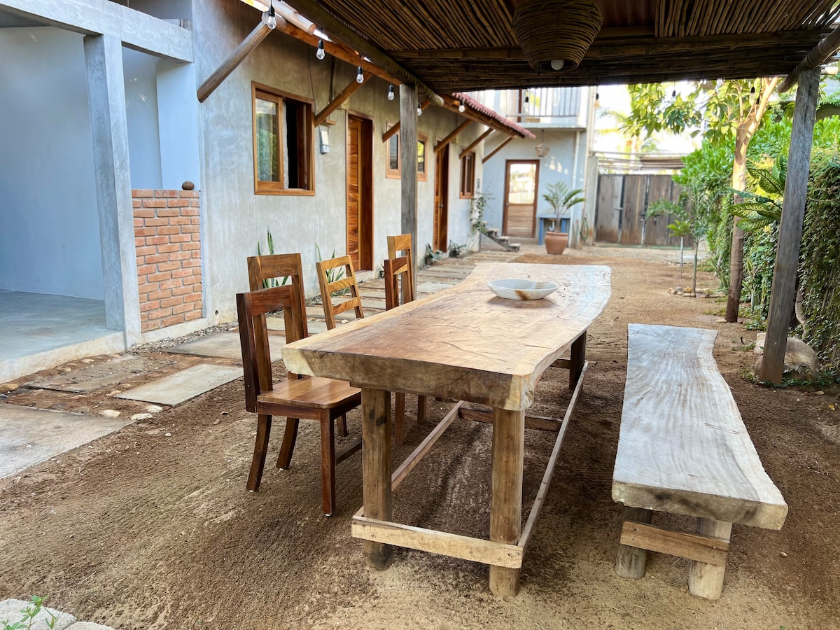 Estudio privado rodeado de naturaleza donde disfrutaras de tranquilas y estrelladas noches. La habitación es completamente Independiente, agua caliente, cama Queen size Cuenta con cafetera, frigobar, licuadora, parrilla y los utensilios necesarios para poder tomar un desayuno o cena sencillos. Tambien cuenta con area especial afuera donde podras lavar trastes y poner a secar las toallas Es de muy facil acceso a trasporte publico y a nos encontramos a10 minutos del centro de Puerto Escondido