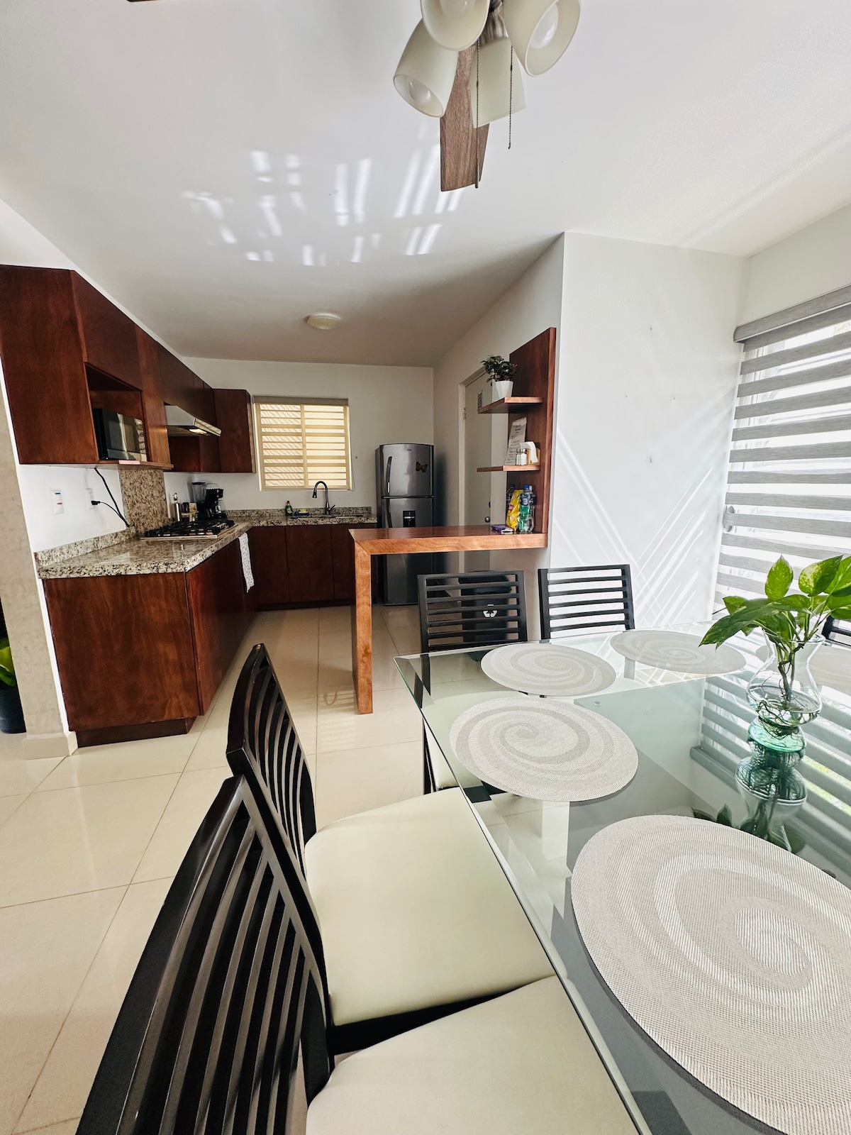 Departamento entero, en recámara tiene cama King Size y 2 sofá cama, aire acondicionado frio/calor, TV, closet y cajoneras. Además, tiene exclusivamente para ti: sala con 2 sofá cama, baño completo, barra comedor, cocina (con refri, estufa, micro ondas, horno, cafetera, nutribullet, sartenes, platos, etc.) Wi-fi rápido de 80MB, TV en sala.