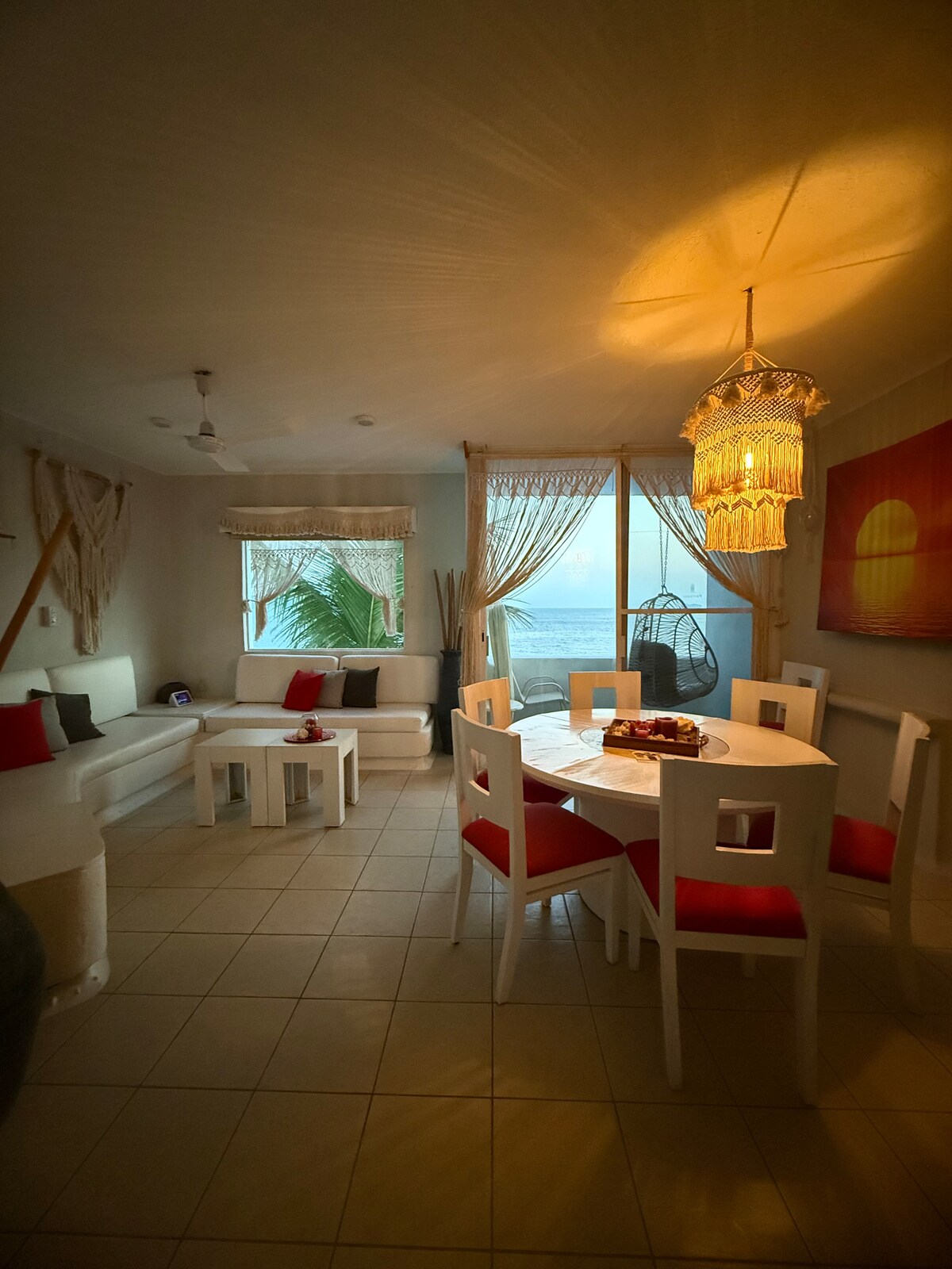 El departamento es de dos personas, los alrededores son preciosos, a tres cuadras del mar, se encuentra en un entorno agradable y tranquilo, acceso a las palapas , dentro de los condominios hay cercas un minisuper, y al entrar hay un oxxo, el departamento es de dos pisos cuenta con una terraza y un jacuzzi en la planta de arriba privado, cuenta con tv con cable y wifi. Se cobrar a cada limpieza en las reservaciones de más de 8 días, en caso de que requieran el servicio.