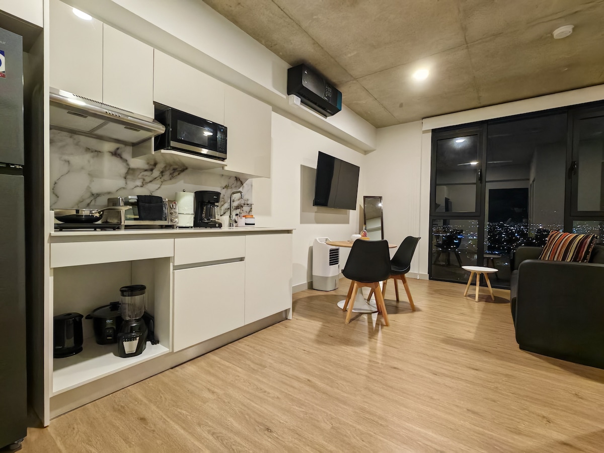 Disfruta de la tranquilidad de este smart loft, elegante y céntrico con vista a la ciudad! Ideal para relajarse. Cuenta con todos los servicios necesarios para hacer de tu estadía la más agradable con la más alta calidad. Su ubicación es favorable ya que se encuentra cerca de restaurantes, centros comerciales y supermercados. Está a solo 15 min del casco central de San José. Cuenta con una gran cantidad de amenidades como piscina temperada, cine, sala de estudio, gimnasio y área de coworking.