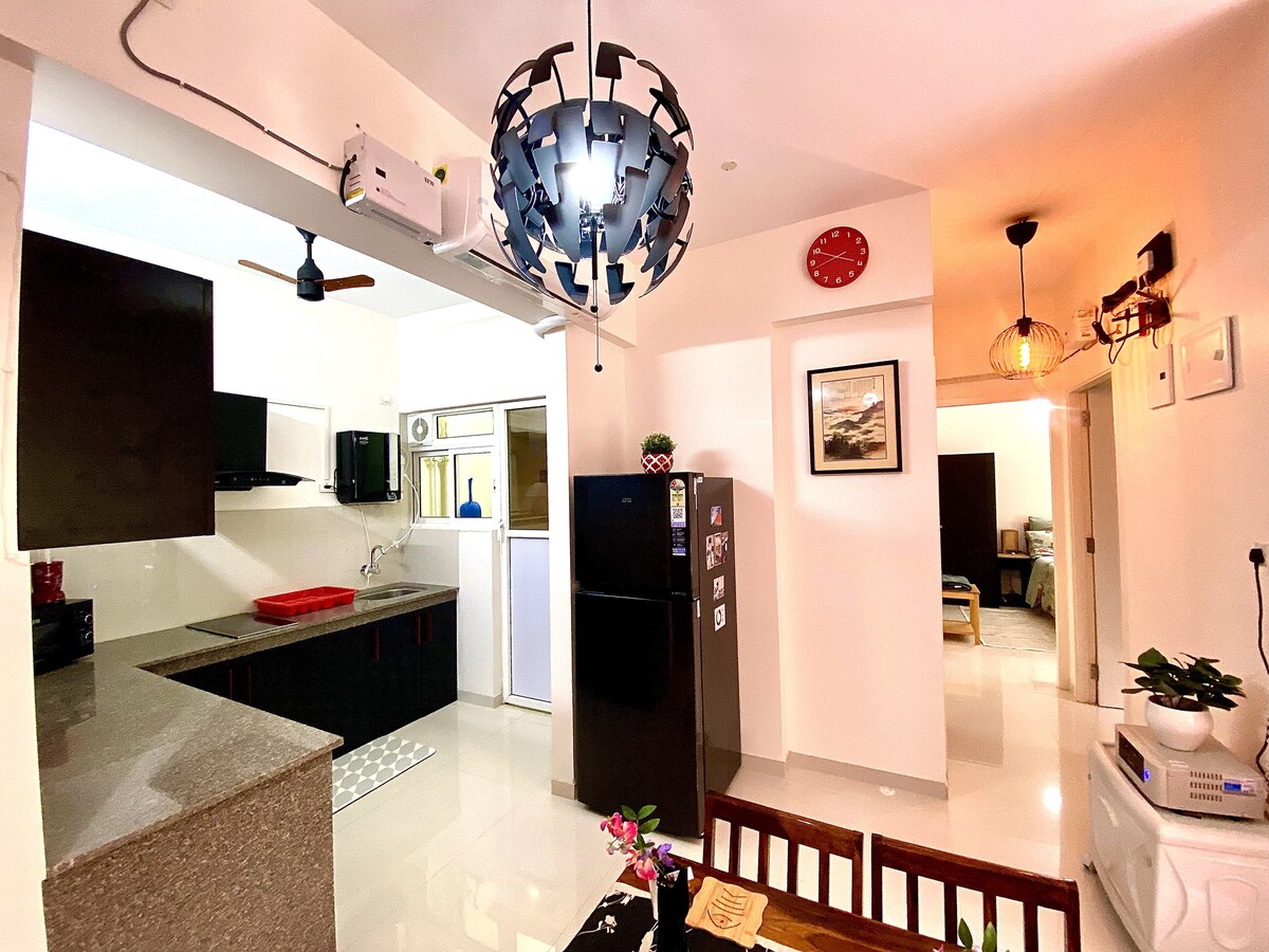 Bienvenido a 'Minka', una elegante casa inteligente de estilo japonés ubicada en TATA Rio de Goa. Este sereno refugio tiene capacidad para cinco personas y cuenta con una suite principal, una acogedora habitación futón y un sofá cama tamaño queen, con privacidad garantizada para tres. Cuenta con una cocina totalmente equipada, un auténtico comedor japonés y un tranquilo balcón. Disfruta de acceso a servicios de primera calidad, como gimnasio, gran piscina compartida, piscina para niños y sala de billar, etc. Ideal para viajes con familia o amigos. ¡Se admiten mascotas, perfecto para tus compañeros peludos!